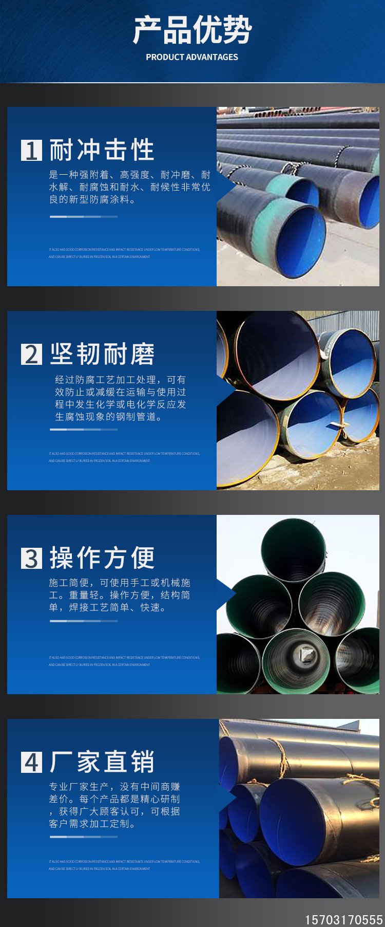 由于是非極性分子與鋼管附著力的持久性差;環(huán)氧樹脂屬于極性分子,有羥基基團在一定溫度下,易與鋼管發(fā)生反應(yīng),附著力極強,但是由于是熱固性物質(zhì),不耐磕碰。因此兩種材料的組合屬于目前防腐行業(yè)最佳搭配。涂塑鋼管行業(yè)由最早是內(nèi)外聚乙烯,由于聚乙烯與鋼管基體附著力不好,后來發(fā)展到內(nèi)外環(huán)氧,但是外環(huán)氧層不耐磕碰,后來發(fā)展到第三代內(nèi)環(huán)氧外聚乙烯,但是單層聚乙烯直接與鋼管結(jié)合還是存在附著力問題,最后升級到現(xiàn)在的第四代防腐內(nèi)熱熔環(huán)氧外三層結(jié)構(gòu)聚乙烯,簡稱TPEP防腐鋼管。