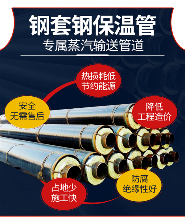 鋼套鋼保溫鋼管也稱為蒸汽運輸用鋼套鋼復合保溫鋼管,它是一種地下直埋式管道。它可以直接埋入地下。工作鋼管的熱膨脹在外管內進行,從而降低了材料成本,縮短工期,保證供熱管道的安全,可在不同溫度環境下安全,廣泛地使用,特別適用于高溫蒸汽管道項目。鋼套鋼保溫管可承受150℃-450℃的溫度。